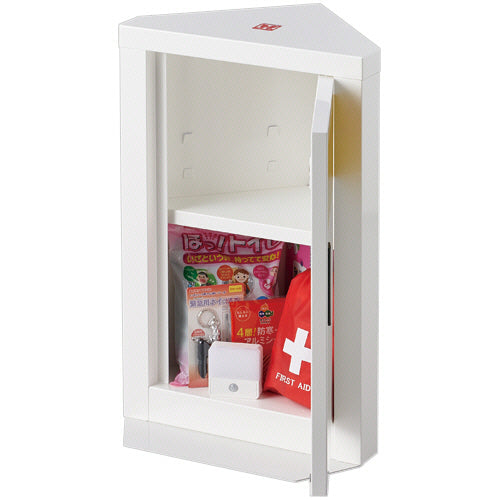 ●セット内容/ウエットタオル、緊急呼子笛、LEDセンサーライト、4層アルミシート、吸盤付クリップ2個、簡易トイレ(4回分)、救急セット(推奨交換:3年)、耐震マット4枚、面ファスナー2枚、棚板1枚、封印シール5枚、キャビネット本体